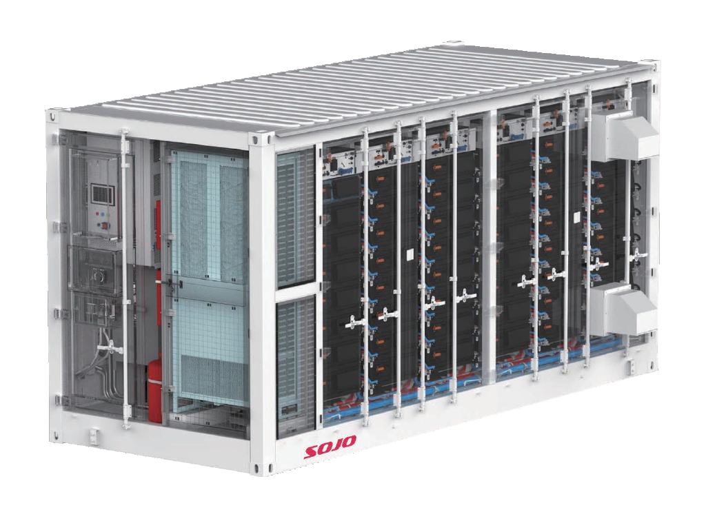 标准化集装箱设计(20尺),非步入式维护,液冷散热、高能量密度、采用9簇电池并联接入PCS