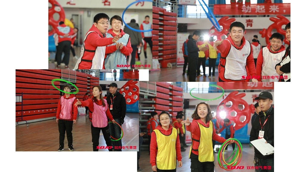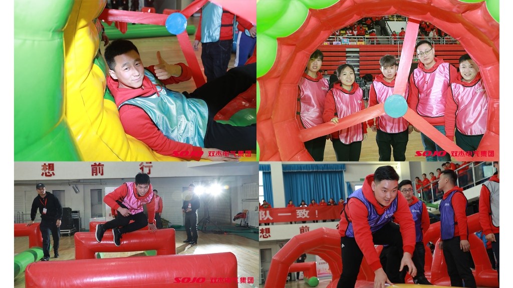 个人赛结束之后,稍事休整,团队赛就开始啦!龙行天下、车轮滚滚、鸿运彩球、蛟龙出海、动感五环、袋鼠运瓜、袋鼠快跑、汉诺塔接力、超级障碍等等,大家团结一致,奋力拼搏的样子,完美展现双杰的活力与精神!